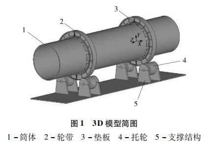 本文以某款谷物類烘干機為研究對象,烘干機一般包括干燥系統(tǒng)、上料系統(tǒng)、熱風爐系統(tǒng)、出料系統(tǒng)、引風系統(tǒng)、控制系統(tǒng)與安全系統(tǒng)。干燥系統(tǒng)是其最為關鍵的系統(tǒng),主要組成部件為筒體、輪帶、墊板、托輪和支撐結構,其中筒體、墊板和輪帶都為設備運行過程中主要的受力部件,且易發(fā)生失效,而托輪和支撐結構所受為體積力,均布于整個結構系統(tǒng),一般不會發(fā)生應力失效。